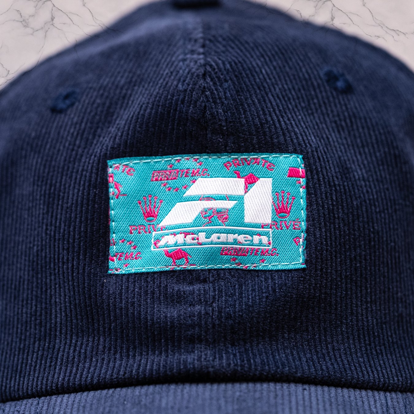 Bespoke F1 embroidered patch on vintage navy corduroy cap in a 'dad' style. One size fits all (unless you're a freak). Comes with cotton drawstring bag.