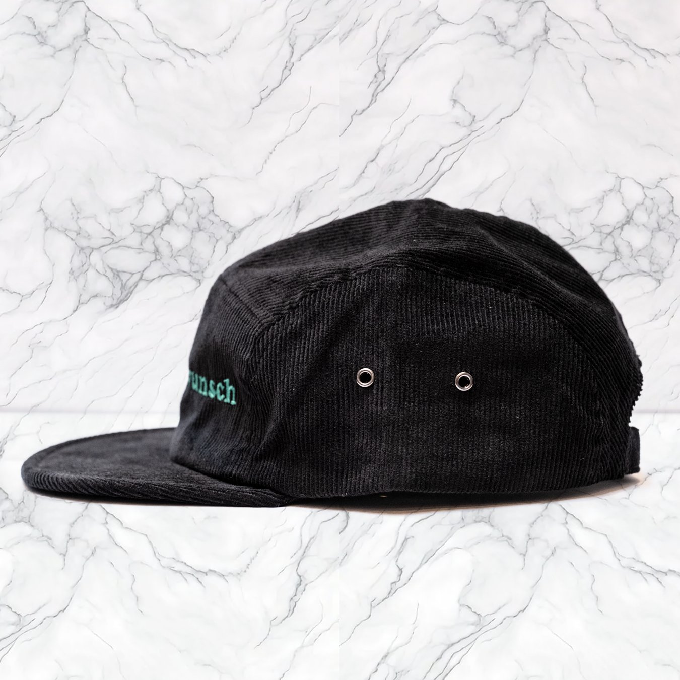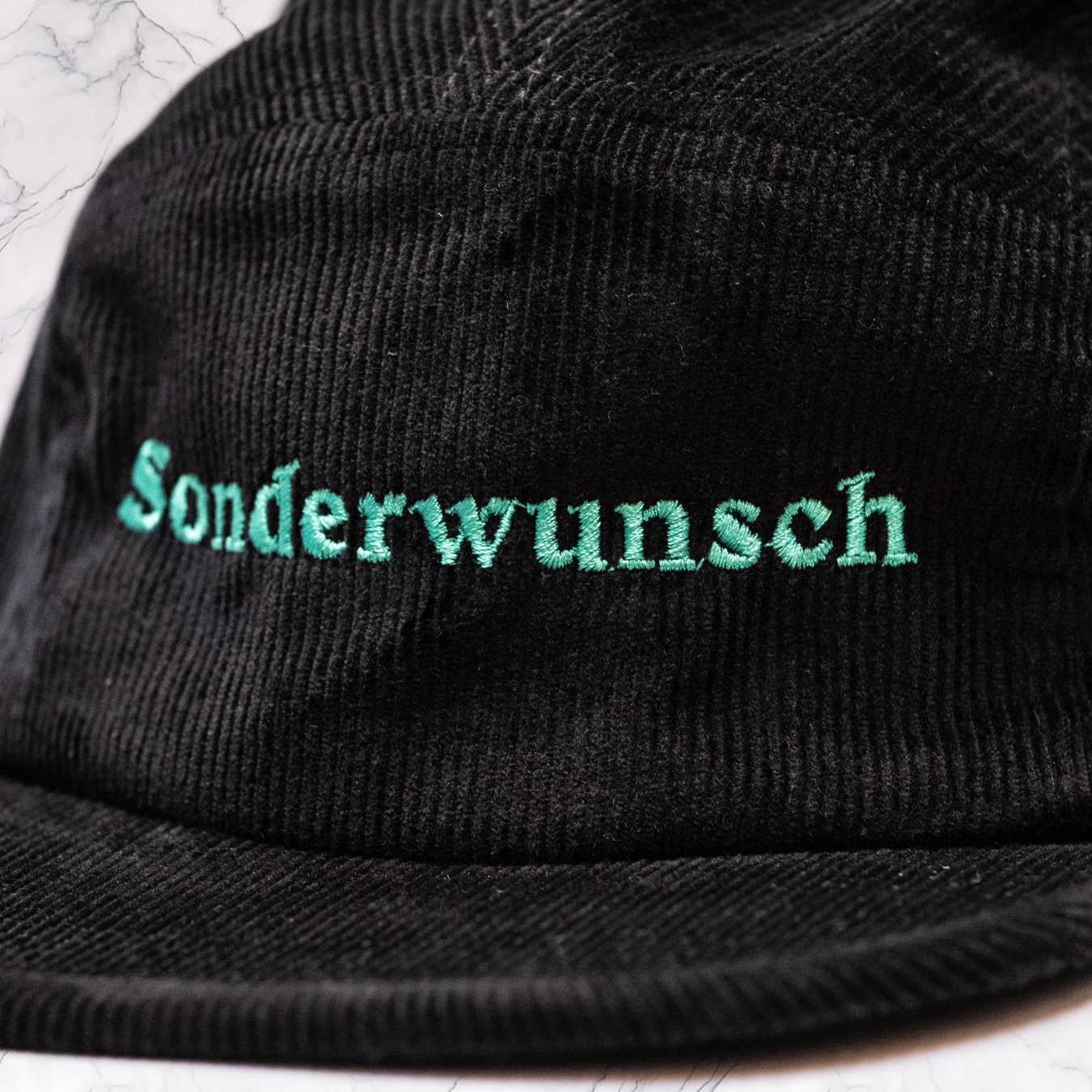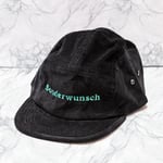 Bespoke 'Sonderwunsch' green embroidered logo on black corduroy in a 'camper' cap style. One size fits all (unless you're a freak). Comes with cotton drawstring bag.